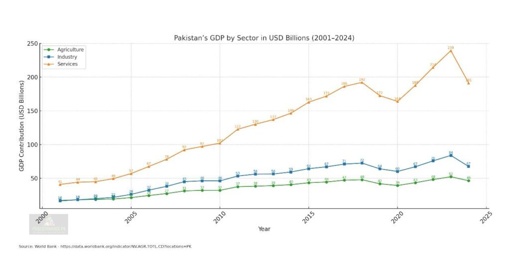 • Pakistan’s GDP by Sector in USD Billions (2001-2024)